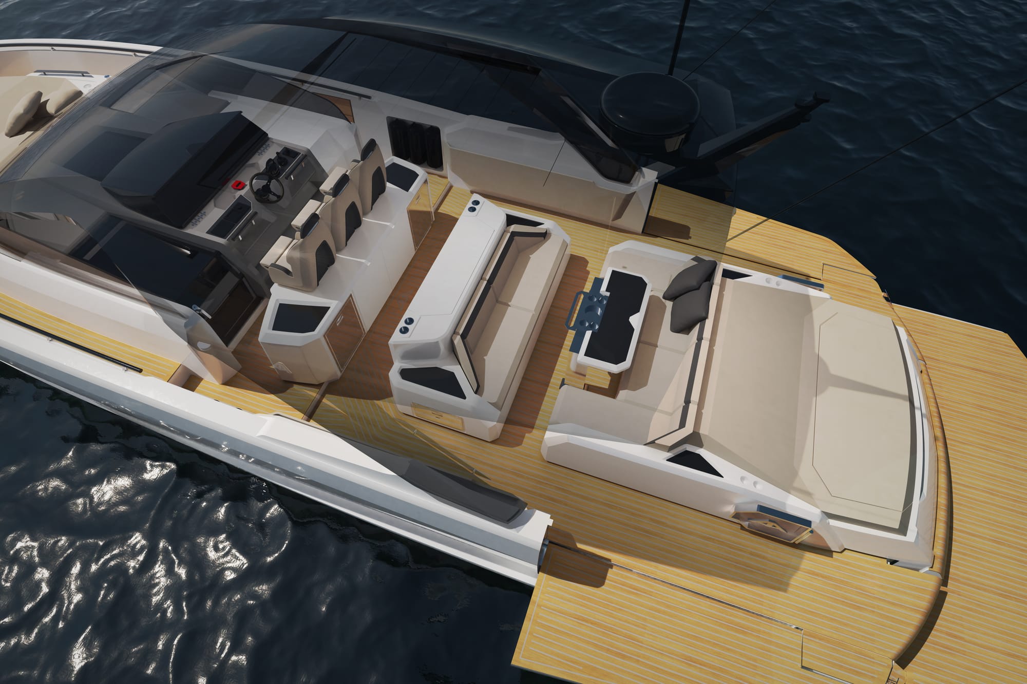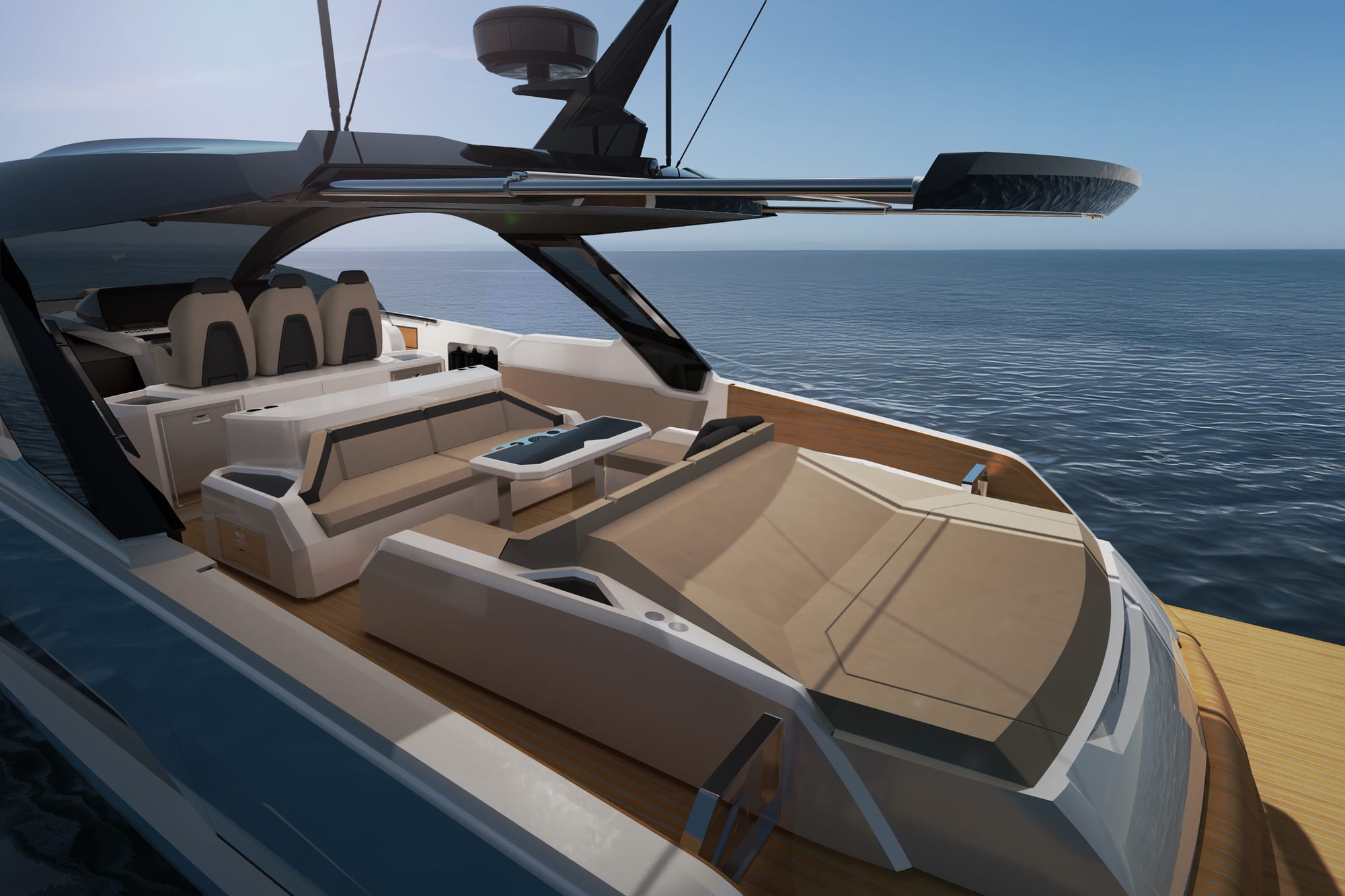 Más allá del impacto visual, el verdadero interés del 577 Coupé está en cómo se vive. Aquí, el diseño no se queda en la superficie, sino que organiza la experiencia a bordo de manera bastante clara. En cubierta, la popa se transforma en un beach club que puede adaptarse según el momento, ampliando la relación directa con el mar. No es un elemento accesorio, sino uno de los puntos centrales del barco. A partir de ahí, el espacio se articula en torno a una zona exterior fluida, donde áreas de descanso, solárium y zonas de sombra conviven sin compartimentaciones rígidas.