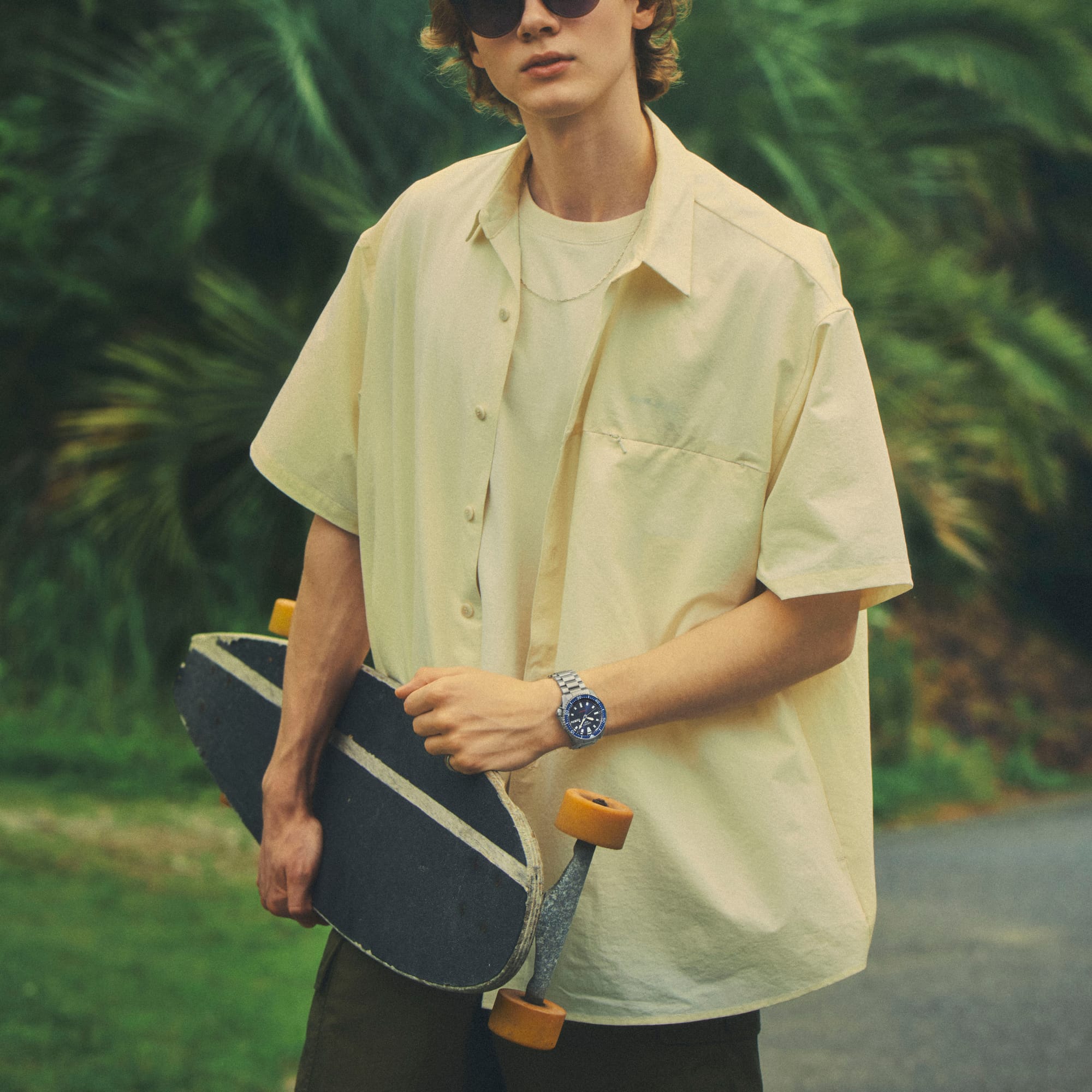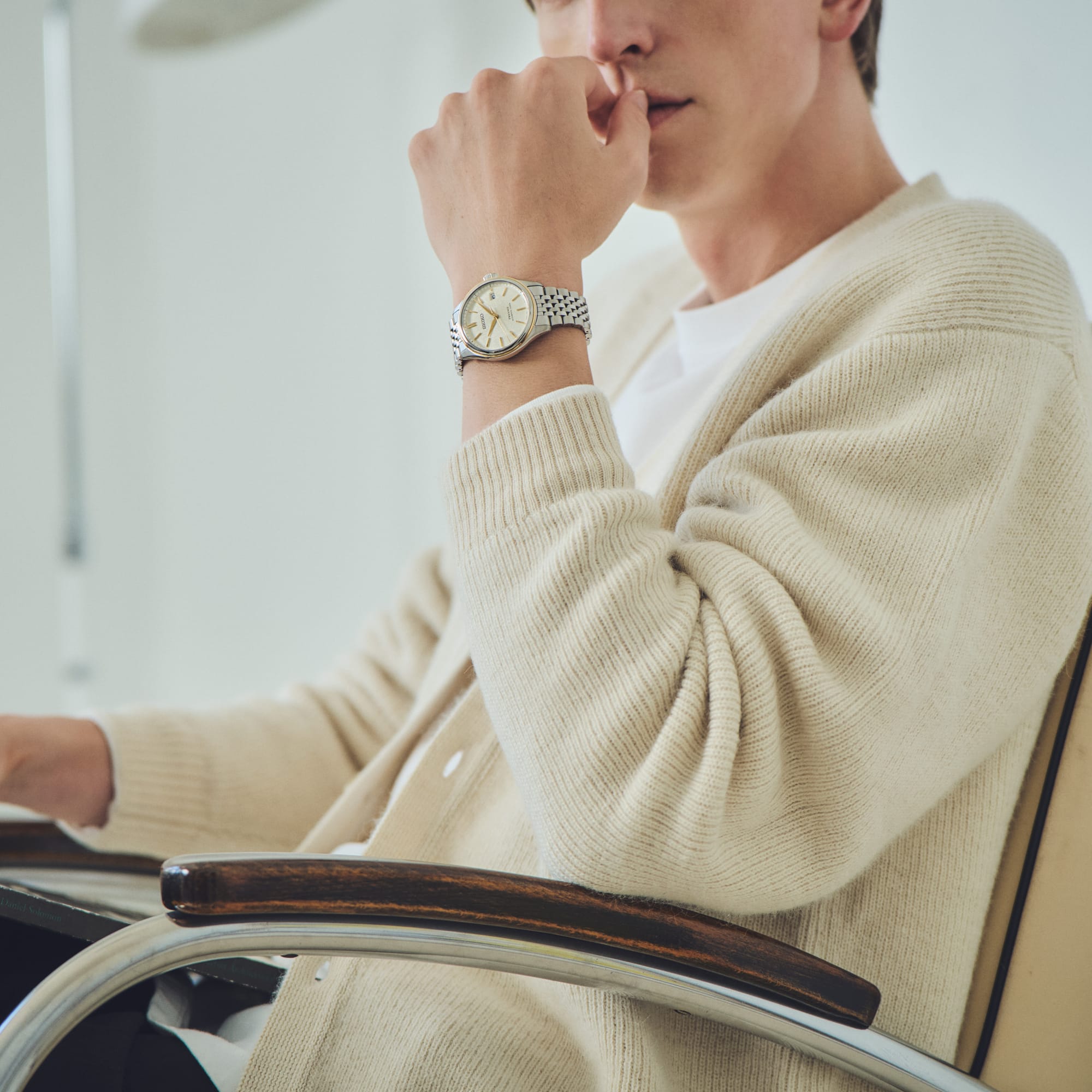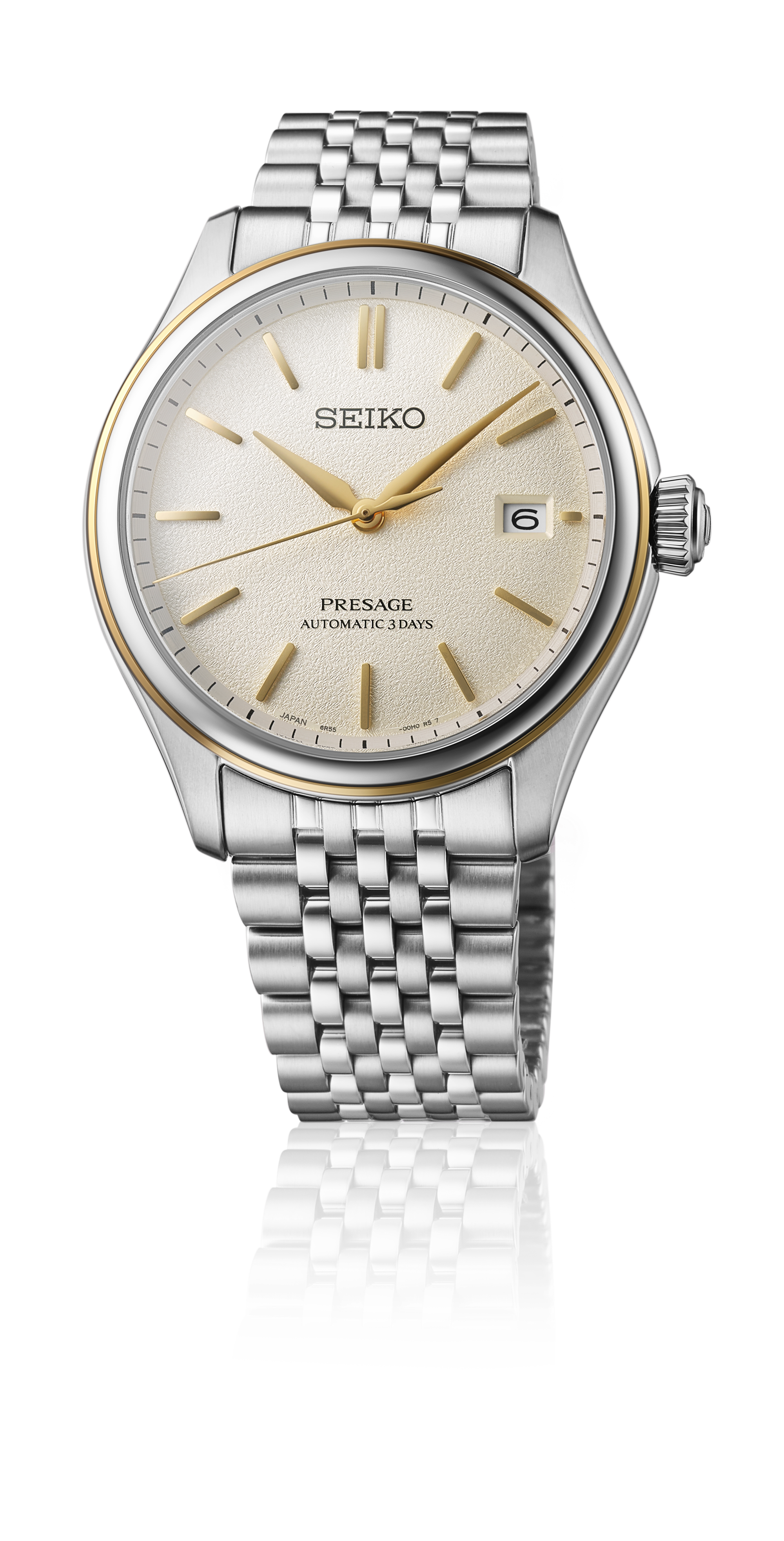 La esfera de este modelo está inspirada en los tejidos de seda japonesa, con una textura suave que cambia de aspecto según la luz. La combinación de acero inoxidable con detalles dorados le da un carácter que funciona igual en una reunión de trabajo que en una cena de compromiso. No es un reloj que grite, es uno que se hace notar cuando alguien se fija de verdad.