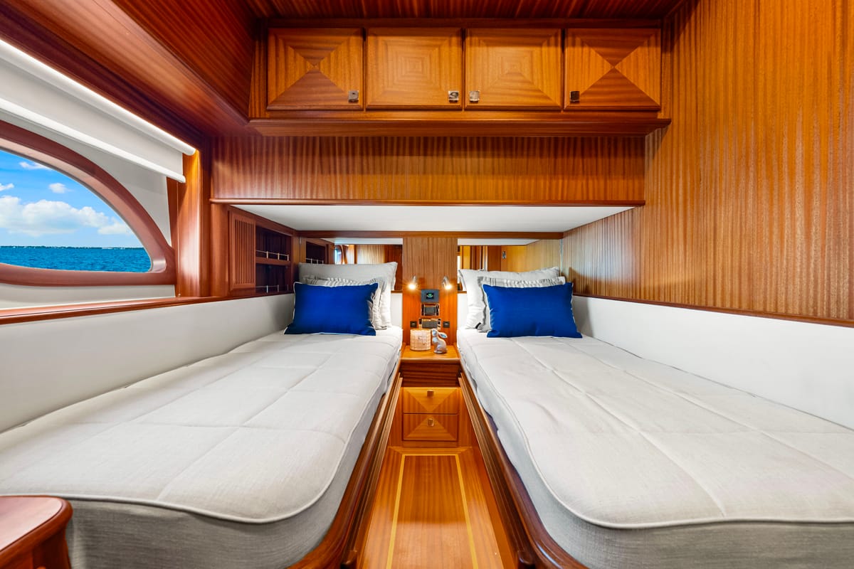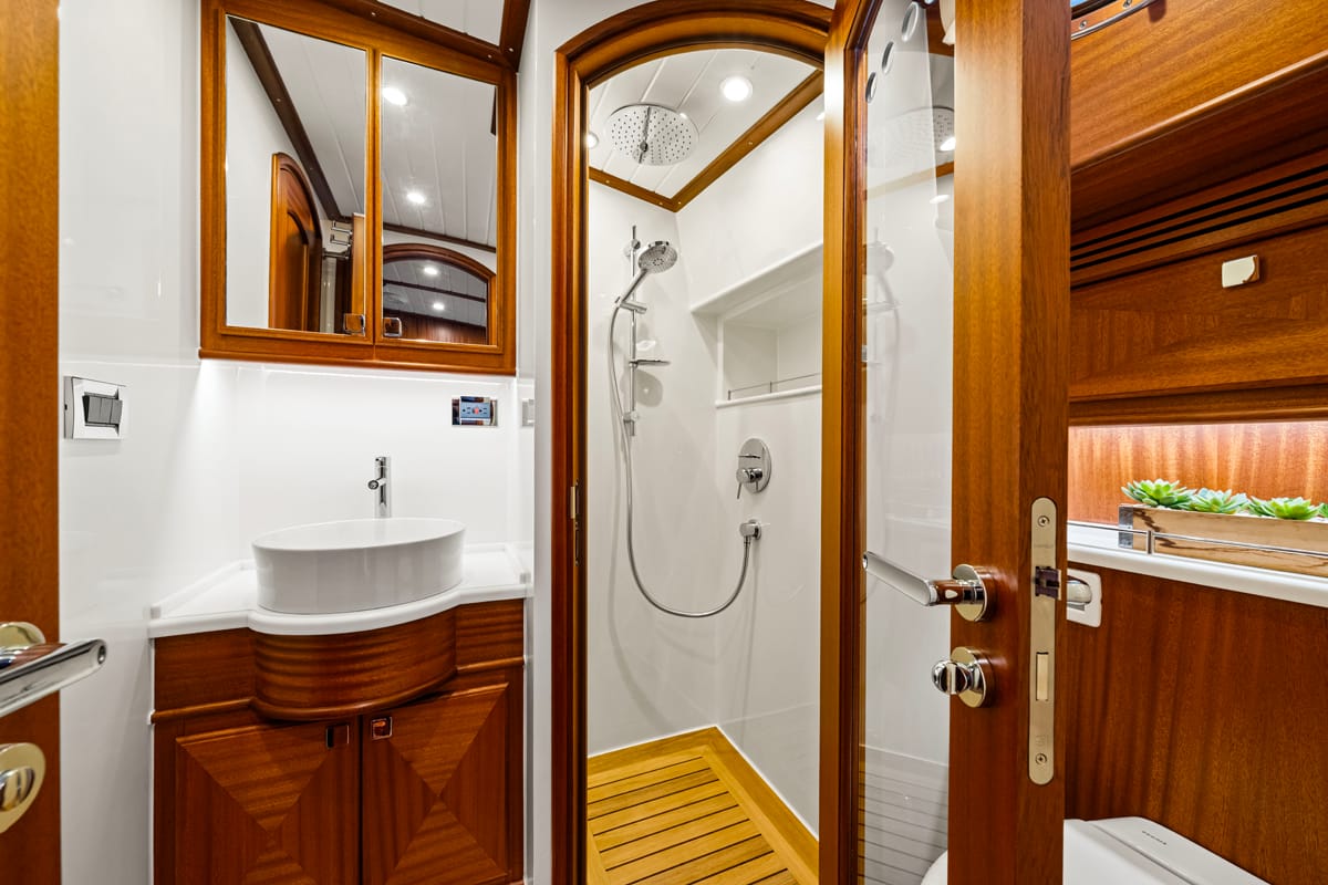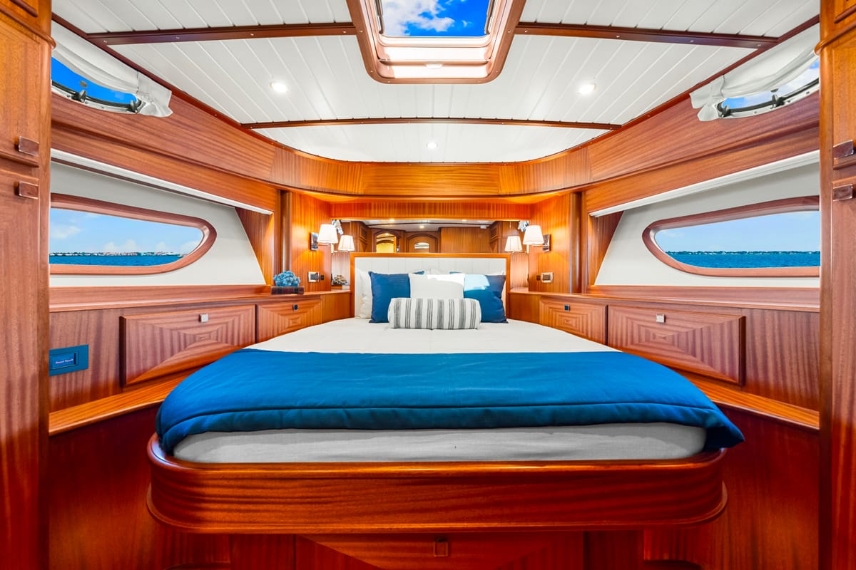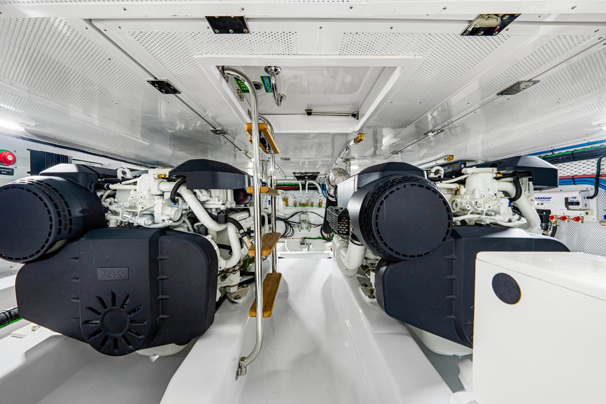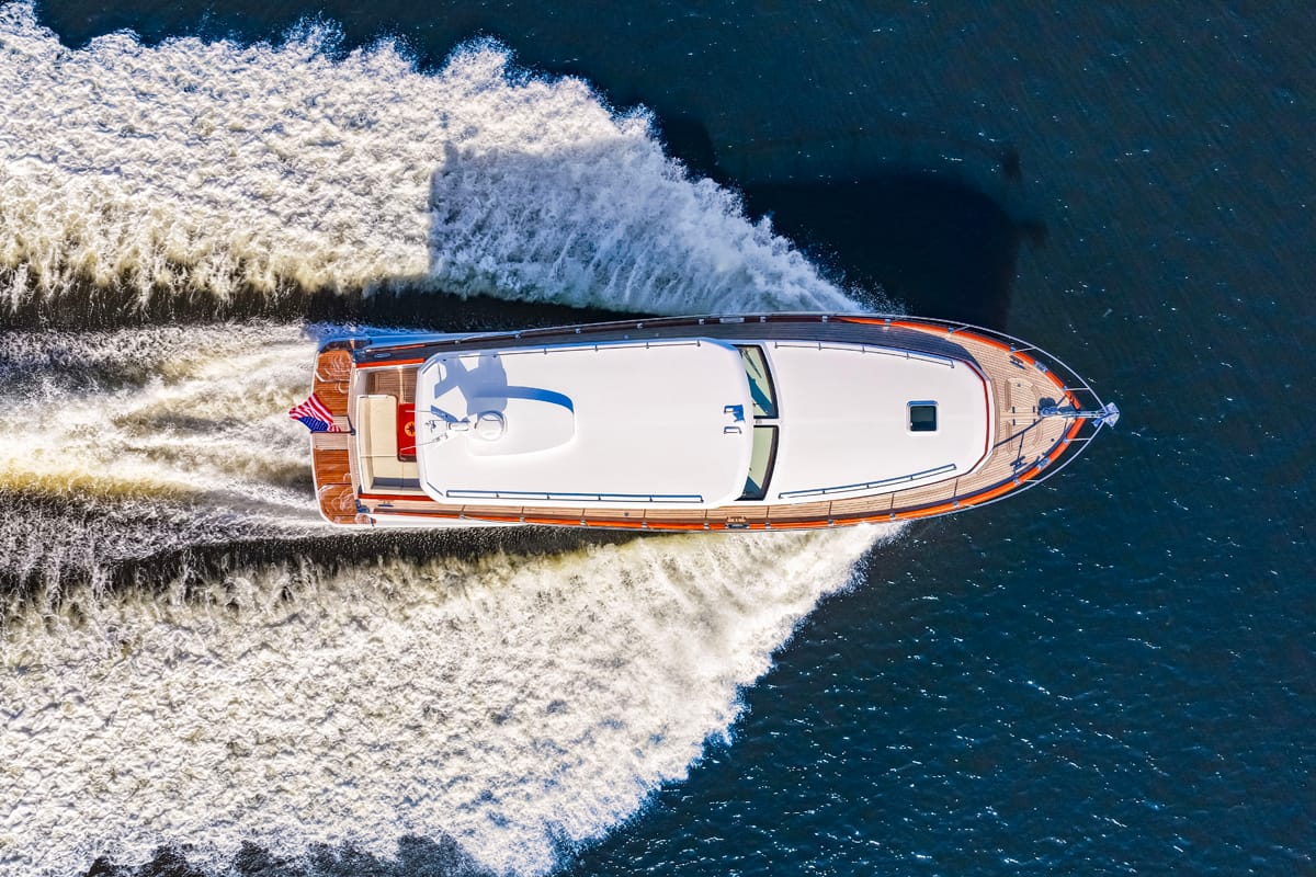 La carena en V profunda garantiza una navegación estable incluso en condiciones exigentes, mientras que elementos como el bow thruster o el sistema de posicionamiento dinámico permiten maniobras más precisas en espacios reducidos. La sensación general no es la de controlar una máquina compleja, sino la de tener siempre el barco bajo control.